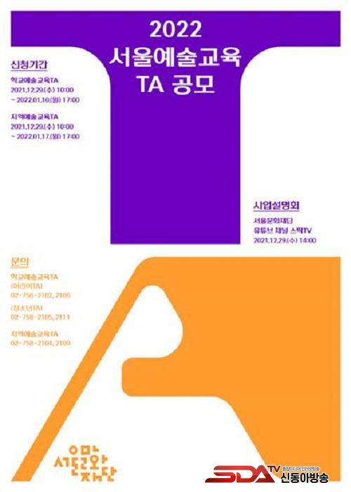 À̹ø 2022³â ¼¿ï¿¹¼ú±³À°»ç¾÷ °ø¸ð´Â 27ÀÏ(¿ù)ºÎÅÍ ¼¼¿ï¿¹¼ú±³À°¼¾ÅÍ ¡®¿¹¼ú³îÀÌ·¦(LAB) TA¡¯ °ø¸ð¸¦ ½ÃÀÛÀ¸·Î 29ÀÏ(¼ö) ¡®Çб³¿¹¼ú±³À°TA¡¯, ¡®Áö¿ª¿¹¼ú±³À°TA¡¯ °ø¸ð µî ÃÑ 9°³ ºÐ¾ß¸¦ Á¢¼ö ¹Þ½À´Ï´Ù.