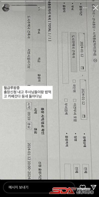 ¿Â¶óÀÎ Ä¿¹Â´ÏƼ¿¡ µû¸£¸é, °æ±âµµ ¾çÁÖ ½Ãû °ÇÃà°ú¿¡ ¼Ò¼ÓµÅÀÖ´Â A¾¾´Â ÃÖ±Ù ÀÚ½ÅÀÇ ÀνºÅ¸±×·¥ °èÁ¤¿¡ "¿ù±Þ ·çÆÎ Áß¡±À̶ó¸ç, ÃâÀå ½Åû¼ ȸéÀ» ÃÔ¿µÇÑ »çÁøÀ» ¿Ã·È´Âµ¥¿ä. ±×´Â Áö³ 12ÀÏ ¿ÀÀü 9½Ã 59ºÐºÎÅÍ °ü³» ÃâÀåÀ» °¡°Ú´Ù°í ÇãÀ§·Î ½ÅûÇÑ ÈÄ, ´Ù¸¥ Á÷¿øµé°ú ÇÔ²² ¹Û¿¡¼ ½Ã°£À» º¸³½ °ÍÀ¸·Î ¹àÇôÁ³½À´Ï´Ù.