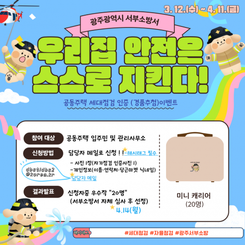 À̺¥Æ® ³»¿ëÀº °øµ¿ÁÖÅà ¼¼´ë ³» ¼Ò¹æ½Ã¼³ ÀÚ°¡Á¡°Ë ÀÎÁõ»çÁø 1Àå°ú ÃÖ¼ÒÇÑÀÇ °³ÀÎÁ¤º¸¸¦ ±âÀÔÇØ ¼ºÎ¼Ò¹æ¼ È«º¸ ´ã´çÀÚ À̸ÞÀÏ·Î ½ÅûÇÏ´Â °ÍÀ¸·Î ¼¼ºÎ Âü¿©¹æ¹ýÀº ¼ºÎ¼Ò¹æ¼ ´ç±Ù¸¶ÄÏ °ø°øÇÁ·ÎÇÊ ¹× ½º·¹µå, ±×¸®°í ºí·Î±×¿¡ °Ô½ÃµÇ¾î ÀÖ´Ù.