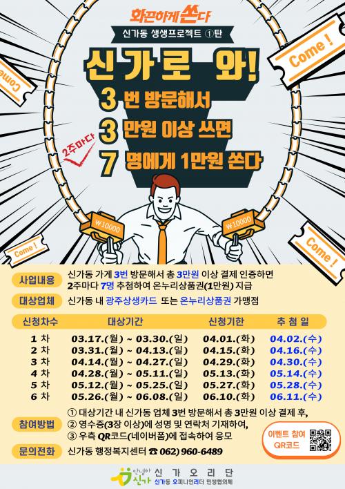¡®½Å°¡·Î¿Í 3¡¤3¡¤7¡¯Àº ½Å°¡µ¿ ¹Î»ý ȸº¹ ÇÁ·ÎÁ§Æ® ¡®½Å°¡·Î¿Í¡¯ÀÇ Ã¹ ¹øÂ° »ç¾÷À¸·Î, ½Å°¡µ¿ ³» ¼Ò»ó°øÀÎ °¡°Ô 3¹ø ¹æ¹®ÇØ 3¸¸ ¿ø ÀÌ»ó °áÁ¦ÇÑ °í°´À» ´ë»óÀ¸·Î 2ÁÖ¸¶´Ù 7¸íÀ» ÃßÃ·ÇØ ¿Â´©¸®»óǰ±Ç 1¸¸ ¿ø±ÇÀ» Áö±ÞÇÑ´Ù.