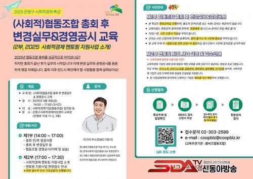 ±³À°¿¡¼´Â ÃÑȸ Àü¡¤ÈÄ Á¡°Ë »çÇ×, ÃÑȸ ÈÄ º¯°æ ½Ç¹«, Çùµ¿Á¶ÇÕ °æ¿µ °ø½Ã ½Ç½À µî ½Ç¹« ´ã´çÀڵ鿡°Ô ²À ÇÊ¿äÇÑ ³»¿ëÀ» ´Ù·ê ¿¹Á¤ÀÌ´Ù. ±³À°ÀÌ ³¡³ ÈÄ, »çȸÀû°æÁ¦±â¾÷ÀÇ °æ¿µ ¹®Á¦ ÇØ°á°ú ¿ª·® °È¸¦ Áö¿øÇÏ´Â »çȸÀû°æÁ¦ ¸àÅ丵 Áö¿ø»ç¾÷¿¡ °üÇØ¼µµ ¼Ò°³ÇÒ ¿¹Á¤ÀÌ´Ù.