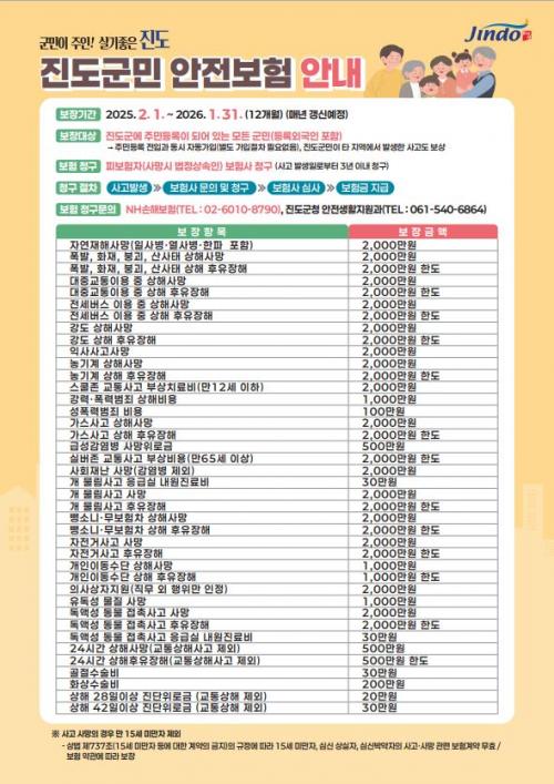 ÀÌ º¸ÇèÀº º°µµÀÇ °¡ÀÔ ÀýÂ÷ ¾øÀÌ Áøµµ±º¿¡ Áֹεî·ÏÀ» µÐ ¸ðµç ±º¹Î(µî·Ï ¿Ü±¹ÀÎ Æ÷ÇÔ)ÀÌ ÀÚµ¿À¸·Î °¡ÀÔµÇ¸ç ´Ù¸¥ º¸Çè°úµµ Áߺ¹ º¸ÀåÀÌ °¡´ÉÇÏ´Ù.