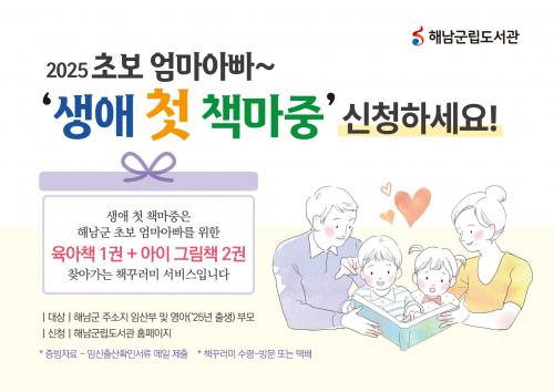 »ý¾Ö ù Ã¥¸¶Áß ¼ºñ½º´Â ÇØ³²±º¿¡ ÁÖ¼Ò¸¦ µÐ ÀӽźΠ¹× ¿µ¾Æ(2025³â Ãâ»ý) ºÎ¸ð¿¡°Ô À°¾Æ °ü·Ã Á¤º¸¸¦ Á¦°øÇϰí, ¾ÆÀÌ¿¡°Ô ù Ã¥À» ¼±¹°ÇÏ´Â ±âȸ¸¦ ¸¶·ÃÇϰíÀÚ À°¾ÆÃ¥°ú ¾ÆÀ̱׸²Ã¥À¸·Î ±¸¼ºµÈ Ã¥ ²Ù·¯¹Ì¸¦ ¼±¹°ÇÏ´Â »ç¾÷À¸·Î ¿À´Â 4¿ùºÎÅÍ ½Åû°¡´ÉÇÏ´Ù.