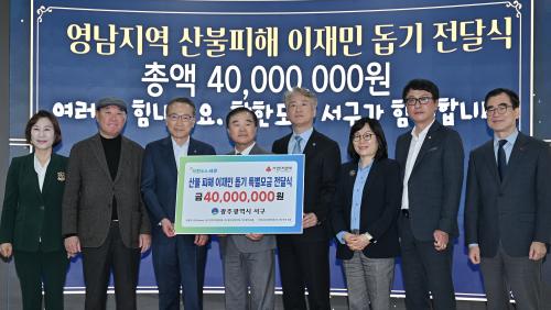 [½Åµ¿¾Æ¹æ¼Û=ÀÌÁöÇö±âÀÚ] ±¤ÁÖ±¤¿ª½Ã ¼­±¸(±¸Ã»Àå ±èÀ̰­)°¡ 3ÀÏ »êºÒ ÇÇÇØ Áö¿ª ÀÌÀç¹ÎµéÀ» µ½±â À§ÇØ °¢°è¿¡¼­ ¸ðÀº ¼º±Ý 4000¸¸¿øÀ» ±¤ÁÖ»çȸº¹Áö°øµ¿¸ð±Ýȸ¸¦ ÅëÇØ Àü´ÞÇß´Ù.
