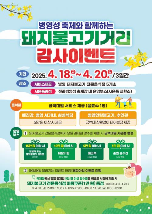 À̹ø Çà»ç´Â ´Ü¼øÇÑ ¸Ô°Å¸® Çà»ç¸¦ ³Ñ¾î Áö¿ª »ó±Ç°ú ÃàÁ¦°¡ ÇÔ²² »ó»ýÇÏ¸ç ´õ ¸¹Àº °ü±¤°´À» À¯Ä¡Çϱâ À§ÇØ ¸¶·ÃµÆ´Ù. º´¿µ µÅÁöºÒ°í±â°Å¸®ÀÇ ¿ì¼öÇÑ À½½ÄÀ» ¾Ë¸®°í º´¿µÀÇ ÀüÅë°ú Çö´ë°¡ ¾î¿ì·¯Áø Ưº°ÇÑ °æÇèÀ» Á¦°øÇϰí, °ÁøÀÇ ¸Å·ÂÀ» ¾Ë¸°´Ù.