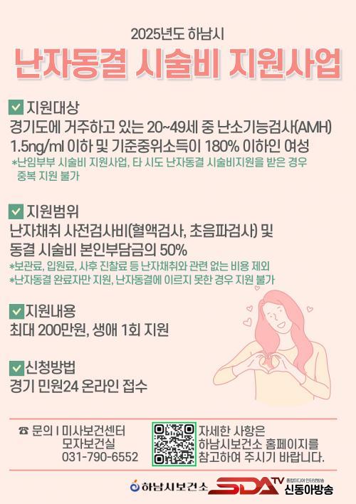 Áö¿ø ´ë»óÀº °æ±âµµ¿¡ °ÅÁÖÇÏ´Â 20¼¼ºÎÅÍ 49¼¼±îÁö(¿¬³ªÀÌ ±âÁØ)ÀÇ ¿©¼ºÀ¸·Î, ³¼Ò±â´É°Ë»ç(AMH) ¼öÄ¡°¡ 1.5ng/ml ÀÌÇÏÀ̰í, °¡±¸ ¼ÒµæÀÌ ±âÁØÁßÀ§¼Òµæ 180% ÀÌÇÏÀÏ °æ¿ì ½Åû °¡´ÉÇÏ´Ù. 2025³â ±âÁØ °¡±¸¿ø ¼öº° ÁßÀ§¼Òµæ 180%´Â 1ÀÎ °¡±¸ ¾à 430¸¸ ¿ø, 2ÀÎ °¡±¸ ¾à 707¸¸ ¿ø, 3ÀÎ °¡±¸ ¾à 904¸¸ ¿ø, 4ÀÎ °¡±¸ ¾à 1,097¸¸ ¿ø ¼öÁØÀÌ´Ù.