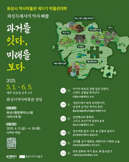°­ÀÇ´Â È­¼º½Ã ¿ª»ç¹Ú¹°°ü 1Ãþ °­´ç¿¡¼­ ÁøÇàµÇ¸ç, ¿ª»ç¿Í °í°íÇп¡ °ü½É ÀÖ´Â ´©±¸³ª Âü¿©ÇÒ ¼ö ÀÖ´Ù. ÃÑ ¼ö°­ ÀοøÀº 60¸íÀ¸·Î, 4¿ù 11ÀϺÎÅÍ È­¼º½Ã ÅëÇÕ¿¹¾à½Ã½ºÅÛ¿¡¼­ ¼±Âø¼øÀ¸·Î ½ÅûÇÒ ¼ö ÀÖ´Ù. Àüü 6°­ Áß 4ȸ ÀÌ»ó ¼ö°­ÇÑ Âü°¡ÀÚ¿¡°Ô´Â ¼ö·áÁõÀÌ ¹ß±ÞµÈ´Ù.