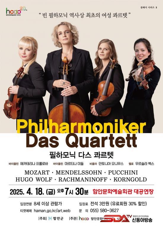 [½Åµ¿¾Æ¹æ¼Û °æ³²ÇÔ¾È=À̽ŵ¿±âÀÚ] ¼¼°è ÃÖ°íÀÇ ¿ÀÄɽºÆ®¶ó Áß Çϳª·Î ²ÅÈ÷´Â ºó ÇÊÇϸð´Ð¿¡¼­ ź»ýÇÑ ÃÖÃÊÀÇ ¿©¼º Çö¾Ç »çÁßÁÖ´Ü ÇÊÇϸð´Ð ´Ù½º Ä⸣ÅÝ(Philharmoniker Das Quartett)ÀÌ ¿À´Â 18ÀÏ(±Ý) Àú³á 7½Ã 30ºÐ ÇԾȹ®È­¿¹¼úȸ°ü ´ë°ø¿¬Àå¿¡¼­ ÇÔ¾È °ü°´À» ã´Â´Ù.