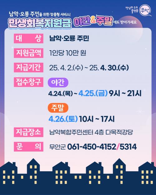 ¾ß°£Àº 4¿ù 24ÀÏ(¸ñ)ºÎÅÍ 25ÀÏ(±Ý)±îÁö ÀÌÆ²°£ ¹ã 9½Ã±îÁö Áö±ÞÇϰí, ÁÖ¸»Àº 4¿ù 26ÀÏ(Åä)¿¡ ¿ÀÀü 10½ÃºÎÅÍ ¿ÀÈÄ 5½Ã±îÁö ³²¾Çº¹ÇÕÁֹμ¾ÅÍ 4Ãþ ´Ù¸ñÀû°´ç¿¡¼ Áö±ÞÇÑ´Ù.