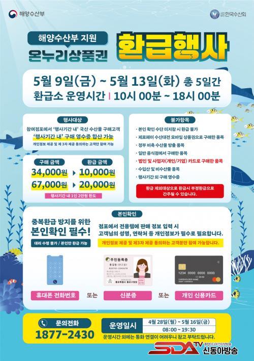 Çà»ç ±â°£ Áß ¿ÀÀ̵µÀüÅë¼ö»ê½ÃÀå ³» Âü¿© Á¡Æ÷¿¡¼ ±¹³»»ê ¼ö»ê¹°À» ±¸¸ÅÇÑ ¼ÒºñÀÚ´Â ±¸¸Å¿µ¼öÁõ°ú ½ÅºÐÁõ ȤÀº º»ÀÎ ¸íÀÇ ÈÞ´ëÀüȸ¦ ÁöÂüÇØ ¿ÀÀü 10½ÃºÎÅÍ ¿ÀÈÄ 6½Ã±îÁö ȯ±Þ ºÎ½º¸¦ ¹æ¹®ÇÏ¸é ±¸¸Å ±Ý¾×ÀÇ ÃÖ´ë 30%¸¦ ¿Â´©¸®»óǰ±ÇÀ¸·Î ȯ±Þ(Çà»ç ±â°£ ³», 1ÀÎ 2¸¸ ¿ø Çѵµ) ¹ÞÀ» ¼ö ÀÖ´Ù.