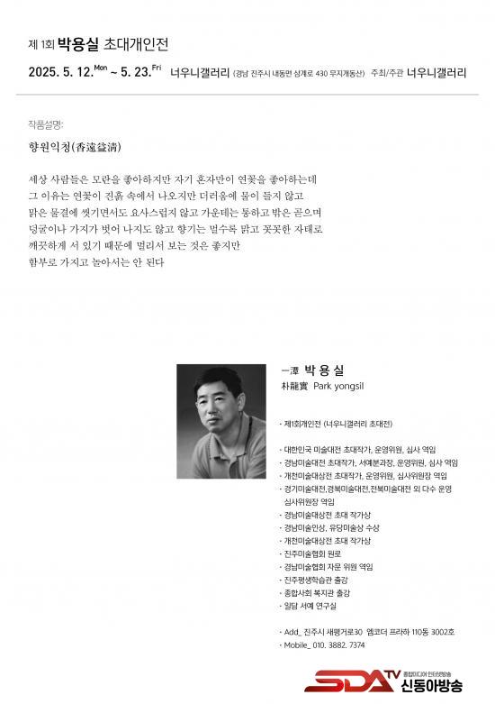 ÀÏ´ã ¹Ú¿ë½Ç ÀÛ°¡´Â ´ëÇѹα¹ ¹Ì¼ú´ëÀü ÃÊ´ëÀÛ°¡À̸鼭 ÁøÁֽà Æò»ýÇнÀ°ü ¼­¿¹°­»ç·Î Ȱµ¿Çϰí ÀÖ´Ù. À̹ø Àü½Ã¿¡¼­´Â ¼­¿¹ ÀÛǰ 20¿© Á¡ÀÌ ¼±º¸À̸ç, ÀÛ°¡ ƯÀ¯ÀÇ ¼­Ã¼¿Í ±íÀº ³»¸éÀÇ ¿ï¸²ÀÌ ´ã±ä ÀÛǰµéÀ» ¼±º¸ÀδÙ. ÀÛ°¡´Â ¼­Ã¼ÀÇ Á¶Çü¼º°ú ±ÛÀÇ Àǹ̸¦ ÇÔ²² Ž»öÇϸç, °ü¶÷°´¿¡°Ô ¿©¿î°ú °¨µ¿À» ÀüÇÏ´Â ÀÛ¾÷À» À̾î¿À°í ÀÖ´Ù.
