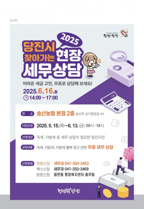 »çÀü ½Åû Á¢¼ö´Â 5¿ù 15ÀϺÎÅÍ 6¿ù 13ÀϱîÁöÀ̸ç, ÀüÈ(¢Ï041-350-3453)³ª ÆÑ½º(¢Ï041-350-3469) ¶Ç´Â ¹æ¹®(´çÁø½Ãû ¼¼¹«°ú, À¾¸éµ¿ ÇàÁ¤º¹Áö¼¾ÅÍ Ãѹ«ÆÀ)À» ÅëÇØ °¡´ÉÇÏ´Ù. ¶ÇÇÑ, »çÀü ½ÅûÀÚ¸¦ ¿ì¼±À¸·Î ÇÏ¿© »ó´ãÀÌ ÁøÇàµÇÁö¸¸, ´çÀÏ ÇöÀå Á¢¼ö ¹× À̿뵵 °¡´ÉÇÏ´Ù.