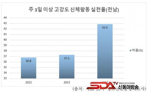 ƯÈ÷ ÁÖ 3ÀÏ ÀÌ»ó °í°µµ ½ÅüȰµ¿ ½ÇõÀ²Àº 42.9%·Î Àü±¹ Æò±Õ(41.5%)À» »óȸÇϸç Àü±¹ 6À§¸¦ ±â·ÏÇß´Ù. ÇØ´ç ¼öÄ¡´Â 2022³â 36.8%, 2023³â 37.3%¿¡¼ ÇØ¸¶´Ù »ó½ÂÇØ ²ÙÁØÇÑ °³¼± È帧À» º¸À̰í ÀÖ´Ù.