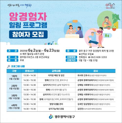 ¾ÏÀ¸·Î ÁöÄ£ ¸ö°ú ¸¶À½À» Ä¡À¯ÇÒ ¸ñÀûÀ¸·Î ÁøÇàµÇ´Â ÀÌ ÇÁ·Î±×·¥Àº 6¿ù 2ÀϺÎÅÍ 23ÀϱîÁö ¸ÅÁÖ ¿ù¿äÀÏ ¿ÀÈÄ 1½Ã 30ºÐºÎÅÍ 3½Ã 30ºÐ±îÁö º¸°Ç¼Ò º¸°Ç±³À°½Ç¿¡¼ ÃÑ 8ȸ ¿î¿µµÈ´Ù. °¢ ȸÂ÷¸¶´Ù °£È£»ç¿Í ¿ø¿¹Ä¡·áº¹Áö»ç, ÀÓ»ó¿µ¾ç»ç µîÀÇ Àü¹®°¡µéÀÌ ±³À°°ú ½Ç½À¹æ½ÄÀ¸·Î ÁøÇàµÈ´Ù.