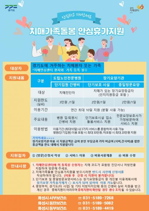 Ä¡¸Å ȯÀÚ¸¦ µ¹º¸´Â °¡Á·ÀÌ ÀÏÁ¤ ±â°£ ÁýÀ» ºñ¿ì°Å³ª Àå±â°£ Ä¡¸Å ȯÀÚ µ¹º½À¸·Î ÁöÄ£ °¡Á·¿¡°Ô ÈÞ½ÄÀÌ ÇÊ¿äÇÑ °æ¿ì, Ä¡¸Å ȯÀÚ°¡ ¾ÈÀüÇÏ°Ô µ¹º½ ¼ºñ½º¸¦ ¹ÞÀ» ¼ö ÀÖµµ·Ï ºñ¿ëÀ» Áö¿øÇÑ´Ù.