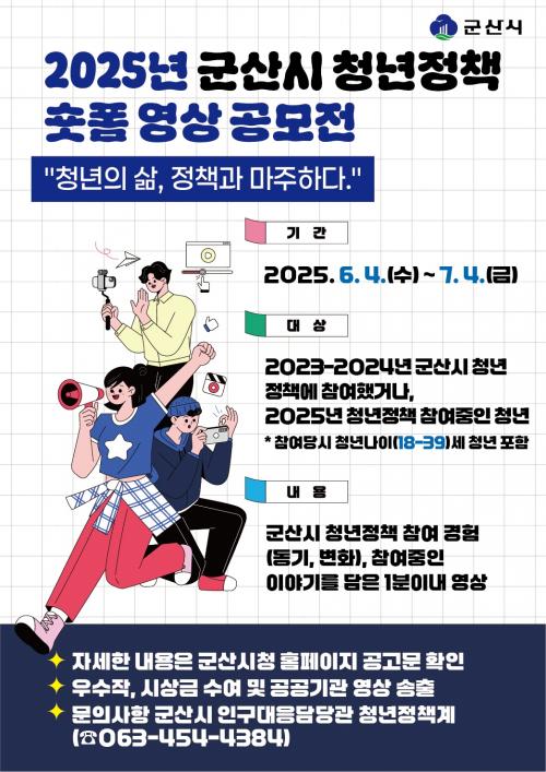 À̹ø °ø¸ðÀüÀº ¡°Ã»³âÀÇ »î, Á¤Ã¥°ú ¸¶ÁÖÇÏ´Ù¡±¸¦ ÁÖÁ¦·Î, ±º»ê½Ã û³âÁ¤Ã¥¿¡ Âü¿©Çß´ø °æÇè ¶Ç´Â ÇöÀç Âü¿© ÁßÀÎ »ç·Ê¸¦ 1ºÐ À̳» ¿µ»óÀ¸·Î Á¦ÀÛÇÏ´Â ¹æ½ÄÀ¸·Î ÁøÇàµÈ´Ù.