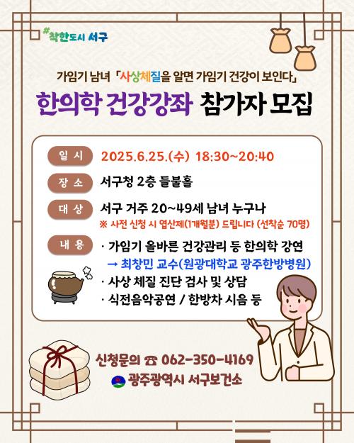 ±³À°Àº 70¸í ´ë»óÀ¸·Î ÁøÇàµÇ¸ç Âü¿©¸¦ Èñ¸ÁÇÏ´Â °æ¿ì ¿À´Â 20ÀϱîÁö ¼±¸Ã» °Ç°ÁõÁø°ú(062-350-4169)·Î ÀüÈ·Î »çÀü½ÅûÇÏ¸é µÈ´Ù.