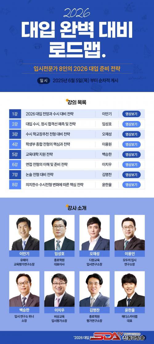 À̹ø ¼³¸íȸ´Â 2026Çг⵵ ´ëÇÐ ÀԽø¦ ÁغñÇÏ´Â ¼öÇè»ý°ú Çкθ𸦠´ë»óÀ¸·Î Çϸç, º¯ÈÇÏ´Â ÀÔ½ÃÁ¦µµ¿¡ ´ëÇÑ Á¤È®ÇÑ Á¤º¸¸¦ Á¦°øÇϰí, ÀüÇüº° Àü·«À» ÅëÇØ ½ÇÁúÀûÀÎ ´ëºñ¸¦ µ½´Â´Ù. Àüü 8°³ °ÀÇ·Î ±¸¼ºµÈ ¼³¸íȸ´Â Áö³ 6¿ù 5ÀϺÎÅÍ 11ÀϱîÁö ¼øÂ÷ÀûÀ¸·Î °Ô½ÃµÆÀ¸¸ç, °³²Àΰ ȨÆäÀÌÁö¿Í À¯Æ©ºê ä³ÎÀ» ÅëÇØ ´©±¸³ª ¹«·á·Î ½ÃûÇÒ ¼ö ÀÖ´Ù.
