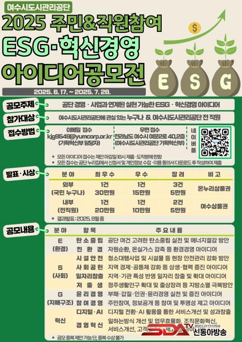 [½Åµ¿¾Æ¹æ¼ÛÀü³²¿©¼ö=±è±â³² ±âÀÚ] ¿©¼ö½Ãµµ½Ã°ü¸®°ø´Ü(ÀÌ»çÀå ±èÀ¯È­)Àº âÀÇÀûÀ̰í Çõ½ÅÀûÀÎ °úÁ¦¸¦ ¹ß±¼Çϰí, ÁÖ¹ÎÂü¿©°æ¿µÀ» °­È­Çϱâ À§ÇØ ¡®ESG¡¤Çõ½Å°æ¿µ ¾ÆÀ̵ð¾î¡¯ °ø¸ðÀüÀ» °³ÃÖÇÑ´Ù°í ¹àÇû´Ù.