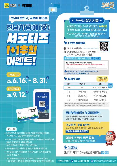 À̺¥Æ®¿¡ ´ëÇÑ ÀÚ¼¼ÇÑ ³»¿ëÀº Àü³² »ç¶û¾Ö ¼­Æ÷ÅÍÁî Àü¿ë ´©¸®Áý (https://namdo2.jeonnam.go.kr/jnsupports/)°ú īī¿ÀÅåä³Î, ÀνºÅ¸±×·¥ µî SNS¸¦ ÅëÇØ È®ÀÎÇÒ ¼ö ÀÖ´Ù.
