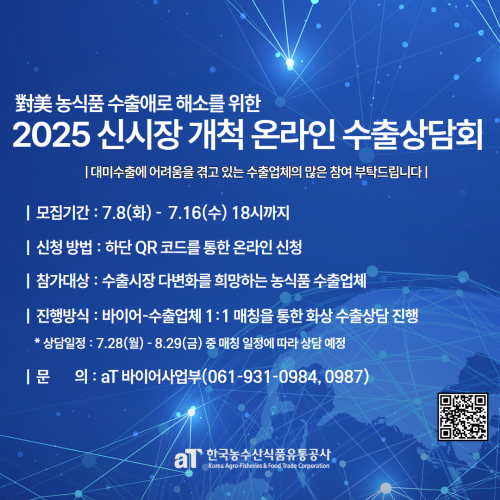 ½Åû ´ë»óÀº ±¹³» ³ó¸²Ãà»ê½Äǰ »ý»ê¡¤¼öÃâ±â¾÷À̸ç, ½Åû ¹æ¹ý°ú ÀÏÁ¤ µî ÀÚ¼¼ÇÑ ³»¿ëÀº aT ¼öÃâÁ¾ÇÕÁö¿ø½Ã½ºÅÛ(global.at.or.kr) °øÁö»çÇ׿¡¼ È®ÀÎÇÒ ¼ö ÀÖ´Ù.