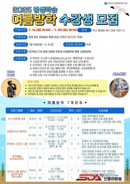 ¿î¿µ °Á´ AI ½º¸¶Æ®ÆÊ ±³½Ç, ģȯ°æ ºñ°Ç º£ÀÌÅ·(2°³ ¹Ý), ±¹¹ÎMC ½ºÇÇÄ¡ ½ºÄð, âÀÛ¿¹¼ú ½Ì¾î¼Û¶óÀÌÅÍ, ³» ¾ÈÀÇ ³ª¸¦ ±ú¿ì´Â »ó»ó·Â ºÐÀå, (Ư¼öºÐÀå)[2°³ ¹Ý] µî ÃÑ 7°³À̸ç, 7¿ù 28ÀϺÎÅÍ 8¿ù 8ÀϱîÁö °Áº°·Î ¿ÀÀü ¶Ç´Â ¿ÀÈÄ¿¡ ÁøÇàµÈ´Ù. Âü¿© ´ë»óÀº À强 ¶Ç´Â Àü¶ó³²µµ ÇлýÀ̸ç, °Áº°·Î ¼ö° ´ë»ó ¿¬·ÉÀº ´Ù¸£´Ù.