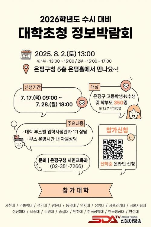 Çà»ç´Â ¿ÀÈÄ 1½ÃºÎÅÍ 5½Ã±îÁö ÀºÆò±¸Ã» 5Ãþ ÀºÆòȦ¿¡¼ ÁøÇàµÈ´Ù. Âü°¡¸¦ Èñ¸ÁÇÏ´Â ÁÖ¹ÎÀº »çÀü ½ÅûÀ» ÅëÇØ ÀÔÀå °¡´ÉÇÏ´Ù. ¹Ú¶÷ȸ Âü°¡ÀÚ´Â °¢ ´ëÇÐ ºÎ½º¿¡¼ ÀÔÇлçÁ¤°ü°ú 1:1 »ó´ãÀ» ¹ÞÀ» ¼ö ÀÖÀ¸¸ç, ºÎ½º ¿î¿µ½Ã°£ ³» ÀÚÀ¯·Ó°Ô Âü¿©ÇØ Á¤º¸¸¦ ¾òÀ¸¸é µÈ´Ù.