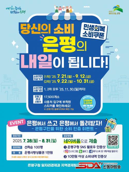 À̹ø À̺¥Æ®´Â ÀºÆò±¸ °ø½Ä SNS Áß 1°÷ ÀÌ»óÀ» ÆÈ·Î¿ìÇϰí, ¹Î»ýȸº¹ ¼ÒºñÄíÆùÀ¸·Î ÀºÆò±¸ ³»¿¡¼ 10¸¸ ¿ø ÀÌ»ó »ç¿ëÇÑ ³»¿ªÀ» ÀÎÁõÇϸé, ÀºÆò»ç¶û»óǰ±Ç 1¸¸ ¿øÀ» Áö±ÞÇÏ´Â ¹æ½ÄÀ¸·Î ÁøÇàµÈ´Ù.