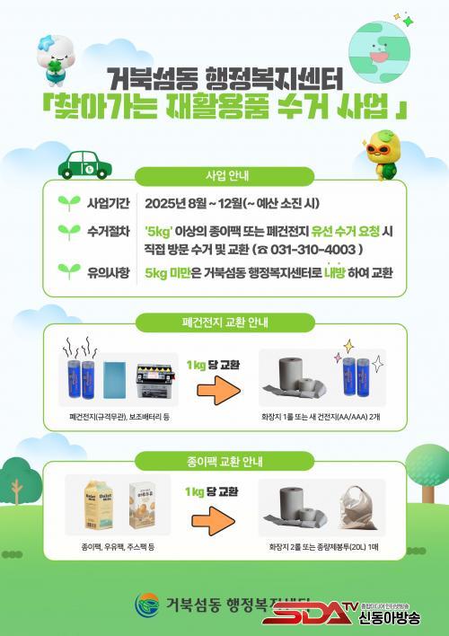 »ç¾÷Àº °ÅºÏ¼¶µ¿ °ü³» Ä«Æä, Çб³, °ø°ø±â°ü µî ÀçȰ¿ëǰÀÌ ¸¹ÀÌ ¹ß»ýÇÏ´Â Àå¼Ò¸¦ Áß½ÉÀ¸·Î ¿î¿µµÇ¸ç, Á¾ÀÌÆÑ ¶Ç´Â Æó°ÇÀüÁö¸¦ 5kg ÀÌ»ó ¸ð¾Æ ¼ö°Å¸¦ ¿äûÇϸé ÀÏÁ¤¿¡ ¸ÂÃç ÇöÀå ¹æ¹®ÀÌ ÀÌ·ïÁø´Ù. ±³È¯ ±âÁØÀº Æó°ÇÀüÁö 1kg´ç ÈÀåÁö 1·Ñ ¶Ç´Â »õ °ÇÀüÁö(AA ¶Ç´Â AAA) 2°³´Ù. ¼ö°Å ½Åû ¹× ¹®ÀÇ´Â °ÅºÏ¼¶µ¿ ÇàÁ¤º¹Áö¼¾ÅÍ(031-310-4003)·Î ÇÏ¸é µÈ´Ù.