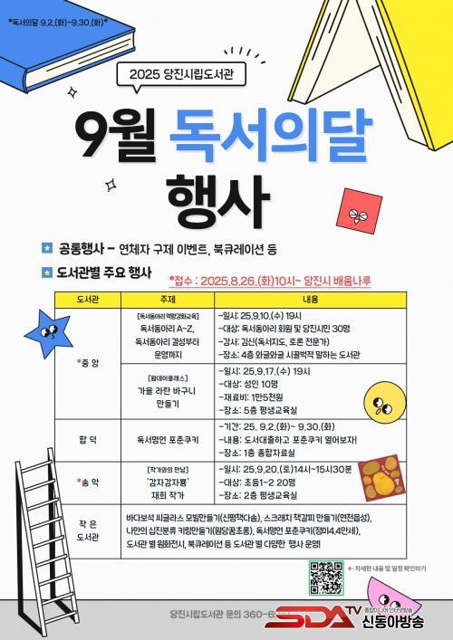 [½Åµ¿¾Æ¹æ¼Û=ÀÌÀçö±âÀÚ] ´çÁø½Ã¸³µµ¼­°üÀº 9¿ù ¡®µ¶¼­ÀÇ ´Þ¡¯À» ¸Â¾Æ, ÇÑ ´Þ°£ ½Ã¸³µµ¼­°ü 15°³¼Ò(°ø°øµµ¼­°ü 3°³¼Ò, ÀÛÀºµµ¼­°ü 12°³¼Ò)¿¡¼­ ´Ù¾çÇÑ ¹®È­Çà»ç¸¦ ¿î¿µÇÑ´Ù.