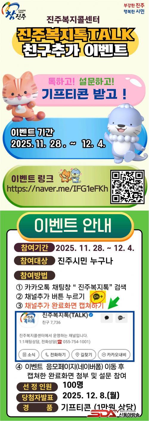 ÁøÁֽô ½Ã¹Î°úÀÇ ¼ÒÅëÀ» °ÈÇÏ°í º¹Áö¼ºñ½º Á¢±Ù¼ºÀ» ³ôÀ̱â À§ÇØ ÁøÁÖº¹ÁöÄݼ¾ÅÍ(ÀÌÇÏ Äݼ¾ÅÍ)¿¡¼ ¿î¿µÇÏ´Â ¡®ÁøÁÖº¹ÁöÅå(TALK)¡¯ ä³ÎÀÇ ¡®Ä£±¸Ãß°¡ À̺¥Æ®¡¯¸¦ 28ÀϺÎÅÍ ¿À´Â 12¿ù 4ÀϱîÁö 7Àϰ£ ÁøÇàÇÑ´Ù°í ¹àÇû´Ù.