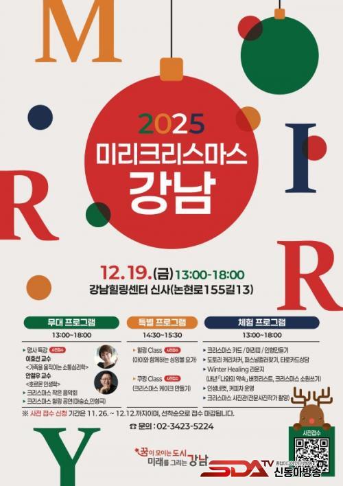 ±¸´Â À̹ø Çà»ç¸¦ À§ÇØ Èú¸µ¼¾ÅÍ ½Ç³»¿Ü °ø°£À» Å©¸®½º¸¶½º ºÐÀ§±â·Î ²Ù¹Ì°í, Âü¿©ÀÚµéÀÌ Æ÷±ÙÇÑ ¿¬¸» ºÐÀ§±â¸¦ ´À³¢¸ç ÈÞ½ÄÀ» ÃëÇÒ ¼ö ÀÖµµ·Ï °ø°£ ¿¬Ãâ¿¡µµ ¼¼½ÉÇÔÀ» ´õÇß´Ù. Çà»ç¿¡ ´ëÇÑ ÀÚ¼¼ÇÑ ³»¿ëÀº ±¸Ã» ȨÆäÀÌÁö(www.gangnam.go.kr) ¶Ç´Â ÀüÈ(¢Ï02-3423-5224)¸¦ ÅëÇØ È®ÀÎÇÒ ¼ö ÀÖ´Ù.