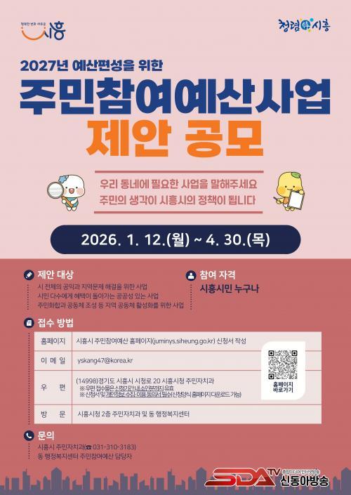 °ø¸ð ½ÅûÀº ¡®½ÃÈï½Ã ÁÖ¹ÎÂü¿©¿¹»ê ´©¸®Áý(https://juminys.siheung.go.kr/)¿¡¼ ÇÒ ¼ö ÀÖÀ¸¸ç ÀüÀÚ¿ìÆí(yskang47@korea.kr)À̳ª ¿ìÆí, ½ÃÈï½Ãû ÁÖ¹ÎÀÚÄ¡°ú ¹× µ¿ ÇàÁ¤º¹Áö¼¾ÅÍ¿¡ ¹æ¹®Çؼ ½ÅûÇÒ ¼ö ÀÖ´Ù.