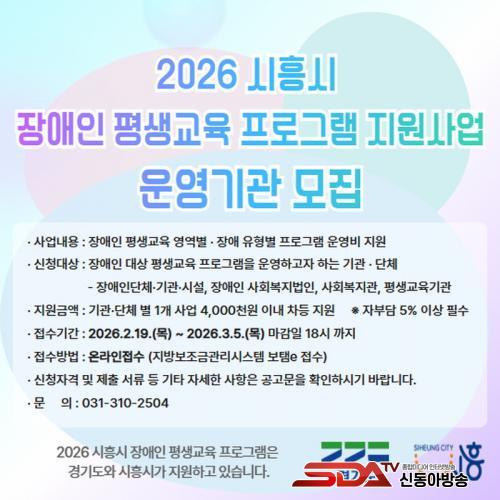 [½Åµ¿¾Æ¹æ¼Û ½ÃÈï½Ã=À̽ŵ¿±âÀÚ] ½ÃÈï½Ã´Â Àå¾ÖÀÎÀÇ ÇнÀ±ÇÀ» º¸ÀåÇÏ°í »çȸÂü¿© ±âȸ¸¦ È®´ëÇϱâ À§ÇØ ¡®2026³â Àå¾ÖÀÎ Æò»ý±³À° ÇÁ·Î±×·¥ Áö¿ø»ç¾÷¡¯À» ÃßÁøÇÏ´Â °¡¿îµ¥ ¿î¿µ±â°üÀ» ¸ðÁýÇÑ´Ù.