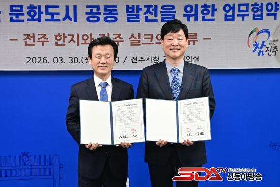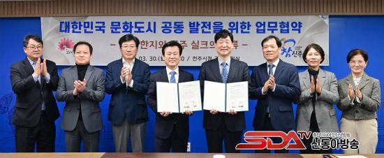 ÁøÁÖ½Ã¿Í ÀüÁֽô Áö³­ 30ÀÏ ÀüÁÖ½Ãû¿¡¼­ µÎ µµ½Ã °ü°èÀÚ°¡ Âü¼®ÇÑ °¡¿îµ¥ ¡®´ëÇѹα¹ ¹®È­µµ½Ã Á¶¼º ¹× ¹®È­ ±³·ù Ȱ¼ºÈ­¸¦ À§ÇÑ ¾÷¹«Çù¾à(MOU)¡¯À» ü°áÇß´Ù°í ¹àÇû´Ù.