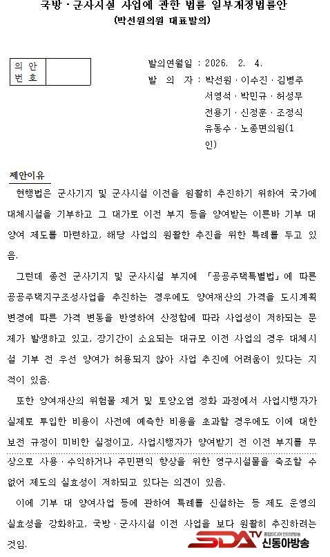 ´õºÒ¾î¹ÎÁÖ´ç ¹Ú¼±¿ø ±¹È¸ÀÇ¿ø(ÀÎõ ºÎÆò±¸À»/±¹¹æÀ§¿øÈ¸)Àº ±º»ç½Ã¼³ ÀÌÀü »ç¾÷À» º¸´Ù ºü¸£°í Çö½ÇÀûÀ¸·Î ÃßÁøÇϱâ À§ÇÑ ¡¸±¹¹æ¡¤±º»ç½Ã¼³ »ç¾÷¿¡ °üÇÑ ¹ý·ü ÀϺΰ³Á¤¹ý·ü¾È¡¹°ú ¡¸±¹À¯Àç»êƯ·ÊÁ¦Çѹý ÀϺΰ³Á¤¹ý·ü¾È¡¹À» ´ëÇ¥¹ßÀÇÇß´Ù.