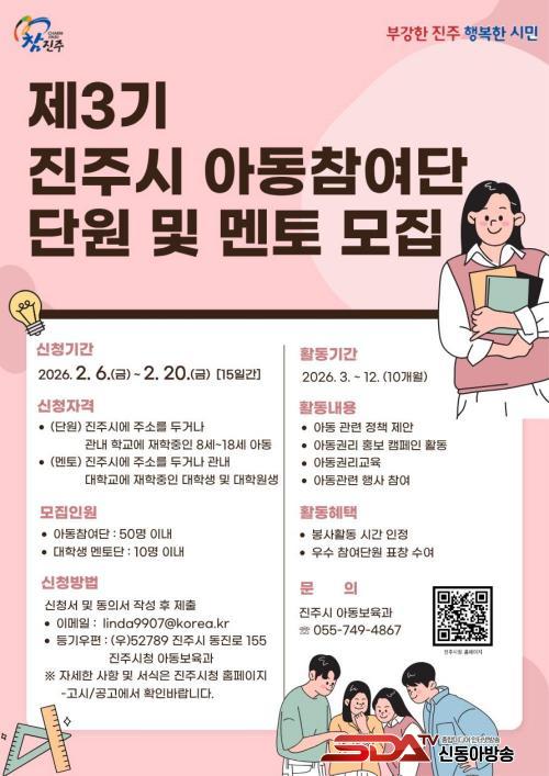 ¾Æµ¿Âü¿©´ÜÀº ¾Æµ¿ÀÇ ±Ç¸® ÁõÁø°ú Á¤Ã¥ Âü¿©¸¦ ¸ñÇ¥·Î ÇÏ´Â ÁøÁÖ½ÃÀÇ ´ëÇ¥ÀûÀÎ ¾Æµ¿ Âü¿© ±â±¸·Î, 2026³â 3¿ùºÎÅÍ 12¿ù±îÁö ¡ã¾Æµ¿Á¤Ã¥ Á¦¾È Ȱµ¿ ¡ã¾Æµ¿±Ç¸® ±³À° ¹× ¾Æµ¿±Ç¸® Ä·ÆäÀΠȰµ¿ Âü¿© ¡ã¾Æµ¿°ü·Ã Çà»ç Âü¿© µî ´Ù¾çÇÑ È°µ¿À» ÇÏ°Ô µÈ´Ù.