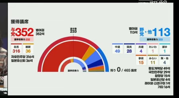 9ÀÏ NHK µî ÀϺ» ¾ð·Ð¿¡ µû¸£¸é, ÀڹδçÀº À̹ø ¼±°Å¿¡¼­ ±âÁ¸ 198¼®¿¡¼­ 118¼®ÀÌ ´Ã¾î³­ Àüü 465¼® Áß ÀüÀï °¡´É ±¹°¡·Î °³ÇåÀÌ °¡´ÉÇÑ 3ºÐÀÇ 2ÀÎ 310¼®À» ³Ñ¾î 316¼®À» Â÷ÁöÇϸ鼭, ´ÙÄ«ÀÌÄ¡ÀÇ Àå±â Áý±Ç Åä´ë±îÁö ¸¶·ÃÇÑ °ÍÀ¸·Î Æò°¡µÆ´Ù.