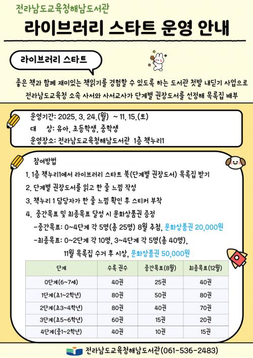 [½Åµ¿¾Æ¹æ¼Û Àü³²Çس²=À̽ŵ¿±âÀÚ] Àü¶ó³²µµ±³À°Ã»Çس²µµ¼­°ü¿¡¼­´Â 2025³â 3¿ù 24ÀϺÎÅÍ 11¿ù 15ÀϱîÁö ¶óÀ̺귯¸® ½ºÅ¸Æ® ÇÁ·Î±×·¥À» ¿î¿µÇÑ´Ù. ¶óÀ̺귯¸® ½ºÅ¸Æ®´Â Àü¶ó³²µµ±³À°Ã» ¼Ò¼Óµµ¼­°ü »ç¼­¿Í »ç¼­±³»çµéÀÌ ´Ü°èº° ±ÇÀåµµ¼­¸¦ ¼±Á¤ÇØ ¸ñ·ÏÁýÀ» ¹èºÎÇÏ°í¡¦
