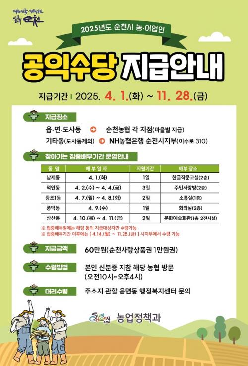 [½Åµ¿¾Æ¹æ¼Û ¼øÃµ=±è¿ëÈÆ ±âÀÚ] ¼øÃµ½Ã(½ÃÀå ³ë°ü±Ô)´Â ³ó¾î¾÷ÀÇ °øÀÍÀû °¡Ä¡ ÁõÁø°ú ³ó¾îÃÌÀÇ Áö¼Ó °¡´ÉÇÑ ¹ßÀüÀ» À§ÇØ 2025³â ³ó¾î¹Î °øÀͼö´ç Áö±ÞÀ» 4¿ù 1ÀϺÎÅÍ °³½ÃÇÑ´Ù°í ¹àÇû´Ù. ³ó¾î¹Î °øÀͼö´çÀº ¿¬ 60¸¸ ¿øÀÌ Áö±ÞµÇ¸ç, Áö¿ª°æÁ¦ Ȱ¼ºÈ­¸¦ À§ÇØ ¼øÃµ»ç¶û»ó¡¦