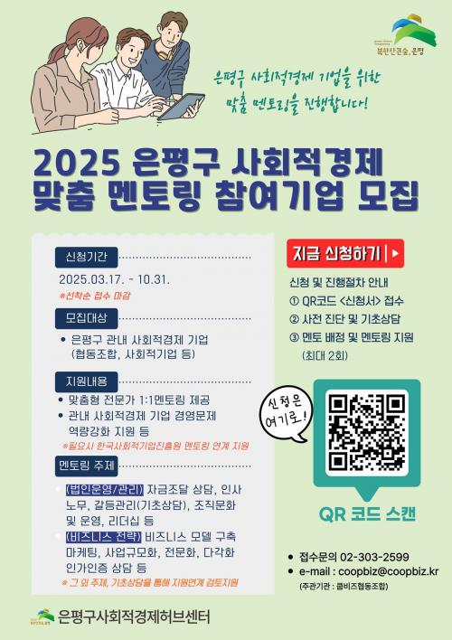 [½Åµ¿¾Æ¹æ¼Û ÀºÆò±¸=À̽ŵ¿±âÀÚ] ÀºÆò±¸´Â °ü³» »çȸÀû°æÁ¦±â¾÷ÀÇ ¼ºÀå Áö¿ø°ú °æ¿µ ¿ª·® °­È­¸¦ À§ÇØ ¡®2025³â ÀºÆò±¸ »çȸÀû°æÁ¦ ¸àÅ丵 »ç¾÷¡¯À» ¿î¿µÇϰí ÀÌ¿¡ Âü¿©ÇÒ ±â¾÷À» ¸ðÁýÇÑ´Ù°í ¹àÇû´Ù. ¡®»çȸÀû°æÁ¦ ¸àÅ丵 »ç¾÷¡¯Àº ÀºÆò±¸¿¡ ÀÖ´Â Çùµ¿Á¶ÇÕ°ú »çȸÀû±â¡¦