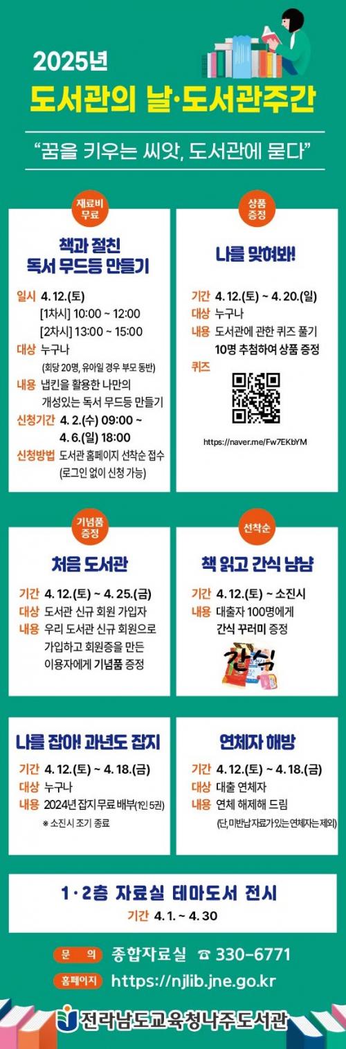 [½Åµ¿¾Æ¹æ¼Û Àü³²³ªÁÖ=À̽ŵ¿±âÀÚ] Àü¶ó³²µµ±³À°Ã»³ªÁÖµµ¼­°üÀº 2025³â µµ¼­°üÀÇ ³¯(4¿ù 12ÀÏ) ¹× µµ¼­°üÁÖ°£(4¿ù 12ÀÏ~18ÀÏ)À» ¸Â¾Æ ´Ù¾çÇÑ µ¶¼­¹®È­ Çà»ç¸¦ ¿î¿µÇÑ´Ù. µµ¼­°üÀÇ ³¯ ¹× µµ¼­°üÁÖ°£Àº µµ¼­°üÀÇ °¡Ä¡¿Í Çʿ伺À» Àû±Ø È«º¸Çϰí ÁֹεéÀÇ µ¶¼­ »ýȰȭ¡¦