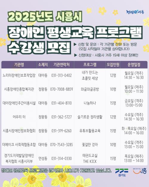 [½Åµ¿¾Æ¹æ¼Û ½ÃÈï½Ã=À̽ŵ¿±âÀÚ] ½ÃÈï½Ã´Â °ü³» ¼ºÀÎ Àå¾ÖÀÎÀ» ´ë»óÀ¸·Î Æò»ý±³À° ÇÁ·Î±×·¥ Á¦°øÀ» À§ÇÑ ¡®2025³â ½ÃÈï½Ã Àå¾ÖÀÎ Æò»ý±³À° ÇÁ·Î±×·¥ Áö¿ø»ç¾÷¡¯ ÇнÀÀÚ¸¦ ¸ðÁýÇÑ´Ù. À̹ø ÇÁ·Î±×·¥Àº Àå¾ÖÀÎÀÇ ÀÚ¸³°ú »çȸÂü¿©¸¦ ÃËÁøÇϱâ À§ÇØ ¸¶·ÃµÆÀ¸¸ç, 4¿ùºÎÅÍ ÇÁ¡¦