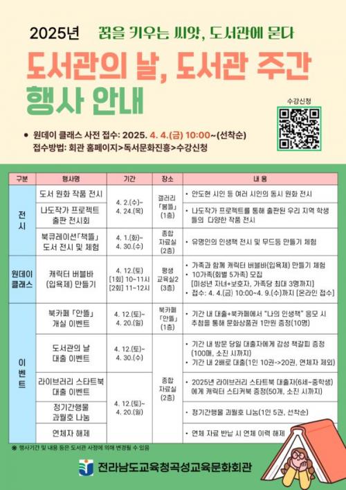 [½Åµ¿¾Æ¹æ¼Û Àü³²°î¼º=À̽ŵ¿±âÀÚ] Àü¶ó³²µµ±³À°Ã»°î¼º±³À°¹®È­È¸°üÀº µµ¼­°üÀÇ ³¯(4¿ù 12ÀÏ)¡¤µµ¼­°ü ÁÖ°£(4¿ù 12~20ÀÏ)À» ¸ÂÀÌÇÏ¿©¡®²ÞÀ» Ű¿ì´Â ¾¾¾Ñ, µµ¼­°ü¿¡ ¹¯´Ù¡¯¸¦ ÁÖÁ¦·Î, Áö¿ª Áֹΰú ÇÔ²²ÇÏ´Â Àü½Ã, üÇè, ´ëÃâ À̺¥Æ® µî ÃÑ 9°³ÀÇ ÇÁ·Î±×·¥À» ¿î¿µÇÑ´Ù. ¡¦
