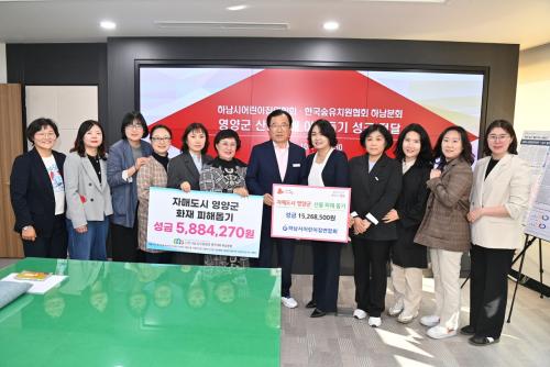 [½Åµ¿¾Æ¹æ¼Û Çϳ²½Ã=À̽ŵ¿±âÀÚ] Çϳ²½Ã¾î¸°ÀÌÁý¿¬ÇÕȸ¿Í (»ç)Çѱ¹½£À¯Ä¡¿øÇùȸ °æ±âÁöȸ Çϳ²ºÐȸ´Â 4¿ù 10ÀÏ Çϳ²½Ãû ½ÃÀå½Ç¿¡¼­ Àڸŵµ½ÃÀÎ ¿µ¾ç±ºÀÇ »êºÒÇÇÇØ µ½±â ±âʽÄÀ» °®°í ÃÑ 2,182¸¸¿øÀÇ ¼º±ÝÀ» ±âŹÇß´Ù. À̹ø ¼º±ÝÀº Çϳ²½Ã¾î¸°ÀÌÁý¿¬ÇÕȸ¿¡¼­ 1,594¸¸¡¦