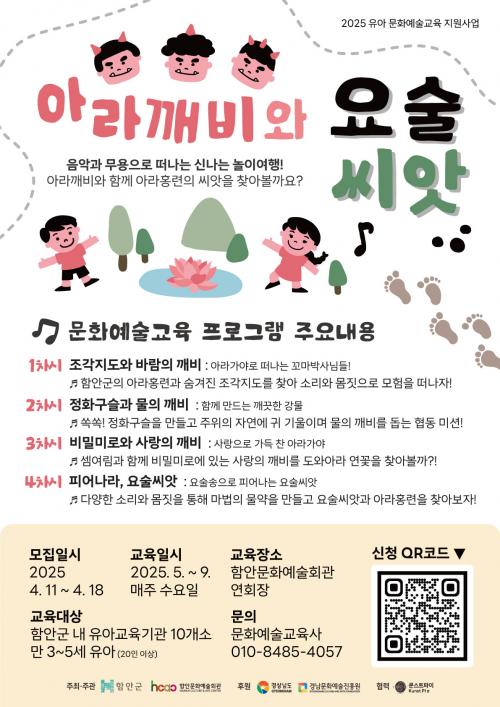 [½Åµ¿¾Æ¹æ¼Û °æ³²ÇÔ¾È=À̽ŵ¿±âÀÚ] ÇԾȹ®È­¿¹¼úȸ°üÀº (Àç)°æ³²¹®È­¿¹¼úÁøÈï¿ø ÁÖ°ü ¡®2025 À¯¾Æ¹®È­¿¹¼ú±³À°Áö¿ø»ç¾÷¡¯ÀÇ ÀÏȯÀ¸·Î ¿î¿µÇÏ´Â À¯¾Æ¹®È­¿¹¼ú±³À° ÇÁ·Î±×·¥ ¡®¾Æ¶ó±úºñ¿Í ¿ä¼ú¾¾¾Ñ¡¯ÀÇ Âü¿© ±â°üÀ» ¸ðÁýÇÑ´Ù°í ¹àÇû´Ù. À̹ø ÇÁ·Î±×·¥Àº Áö¿ª ³» ¸¸3~¡¦