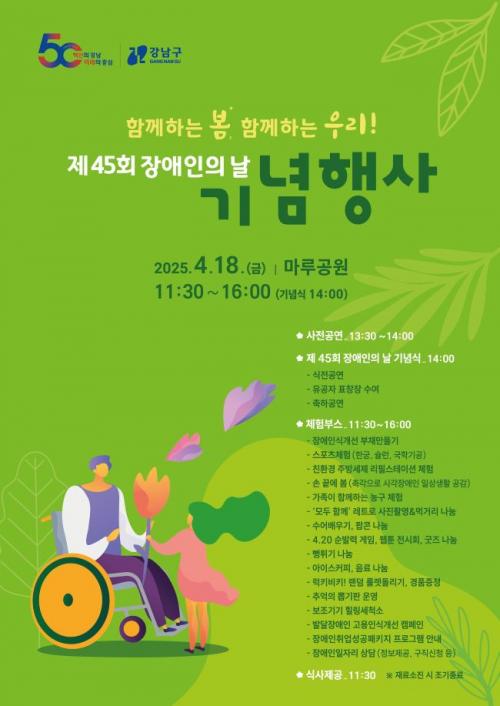 [½Åµ¿¾Æ¹æ¼Û °­³²±¸=À̽ŵ¿±âÀÚ] ²ÞÀÌ ¸ðÀÌ´Â µµ½Ã, ¹Ì·¡¸¦ ±×¸®´Â °­³²±¸°¡ Á¦45ȸ Àå¾ÖÀÎÀÇ ³¯À» ¸Â¾Æ ¿À´Â 4¿ù 18ÀÏ ÀÏ¿øµ¿ ¸¶·ç°ø¿ø¿¡¼­ Àå¾ÖÀΰú ºñÀå¾ÖÀÎÀÌ ÇÔ²²ÇÏ´Â ±â³äÇà»ç¸¦ ¿¬´Ù. ¡®ÇÔ²²ÇÏ´Â º½, ÇÔ²²ÇÏ´Â ¿ì¸®¡¯¸¦ ÁÖÁ¦·Î ¿­¸®´Â À̹ø Çà»ç´Â 1,000¿© ¸íÀÇ ¡¦