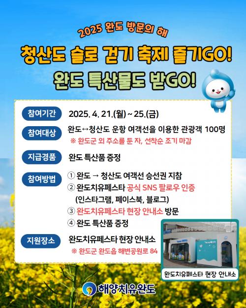 [½Åµ¿¾Æ¹æ¼Û ¿Ïµµ=À̼±Á¾ ±âÀÚ] ¿Ïµµ±ºÀº û»êµµ ½½·Î°È±â ÃàÁ¦ ±â°£ Áß Ã»»êµµ¸¦ ¹æ¹®ÇÑ °ü±¤°´À» ´ë»óÀ¸·Î ¡®¿Ïµµ Ä¡À¯ Æä½ºÅ¸¡¯ ÇöÀå À̺¥Æ®¸¦ ÁøÇàÇÑ´Ù. À̺¥Æ®´Â ¼¶ °ü±¤ Ȱ¼ºÈ­¿Í Ư»êǰ È«º¸¸¦ À§ÇØ ¸¶·ÃµÆ´Ù. À̺¥Æ® Âü¿© ´ë»óÀڴ û»êµµ ¿©°´¡¦