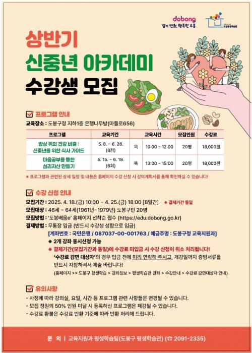[½Åµ¿¾Æ¹æ¼Û µµºÀ±¸=À̽ŵ¿±âÀÚ] ¼­¿ï µµºÀ±¸°¡ 4¿ù 25ÀϱîÁö 2025³â »ó¹Ý±â ½ÅÁ߳⠾ÆÄ«µ¥¹Ì ¼ö°­»ýÀ» ¸ðÁýÇÑ´Ù. À̹ø »ó¹Ý±â ½ÅÁ߳⠾ÆÄ«µ¥¹Ì´Â ¹ä»ó À§ÀÇ °Ç°­ ºñ°á: ½ÅÁß³âÀ» À§ÇÑ ½Ä»ç °¡À̵å, ¸¶À½°øºÎ¸¦ ÅëÇÑ ½É¸®ÀÚ»ê ¸¸µé±â 2°¡Áö °úÁ¤À¸·Î ±¸¼ºµÆ´Ù. ±¸¡¦