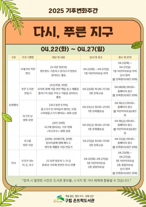 [½Åµ¿¾Æ¹æ¼Û ÀºÆò±¸=À̽ŵ¿±âÀÚ] ¼­¿ï ÀºÆò±¸´Â ±¸¸³ Àº¶ß¶ôµµ¼­°ü¿¡¼­ ±âÈĺ¯È­ ÁÖ°£À» ±â³äÇØ ¡®´Ù½Ã, Ǫ¸¥ Áö±¸¡¯ ¹®È­Çà»ç¸¦ ¿î¿µÇÑ´Ù°í ¹àÇû´Ù. À̹ø ±âÈĺ¯È­ ÁÖ°£ Çà»ç´Â Áֹε鿡°Ô ±âÈĺ¯È­ÀÇ ½É°¢¼ºÀ» ¾Ë¸®°í ȯ°æ º¸È£ÀÇ Á߿伺À» °­Á¶Çϱâ À§ÇØ ¸¶·ÃµÆ´Ù¡¦